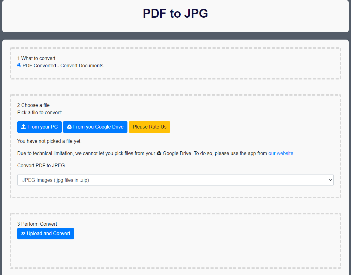 Get your PDF files converted from PDF to JPG format instantly. You dont need to register to begin converting PDF to JPG. Our extension supports PDF conversion to JPG - Convert as many files as you want - Save your output files to either your computer/Google Drive Convert your PDF to JPG now and save it to either your local computer/Google Drive. This PDF to JPG service is 100% free.